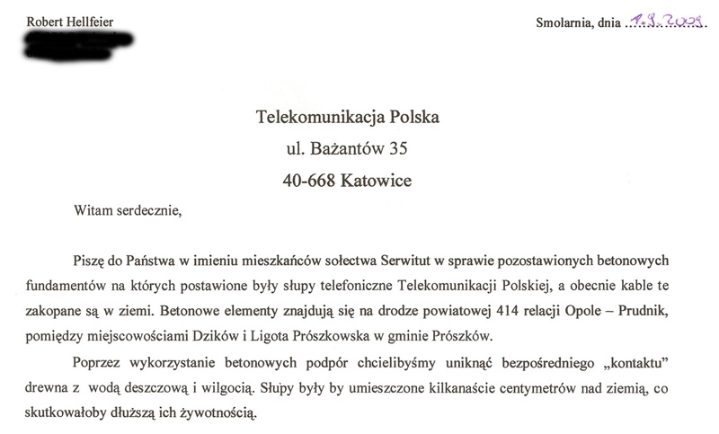 1.09.2009 r. wysłałem pismo do TP z zapytaniem o możliwość pozyskania tychże elementów. Półtorej miesiąca później, 4 października otrzymałem pismo od przedstawiciela TP, który oznajmił, że takiej możliwości nie ma, ale bez najmniejszego problemu możemy nieodpłatnie wykorzystać nieużytkowane od dłuższego czasu betonowe szczudła znajdujące się na Pomologii w Prószkowie.