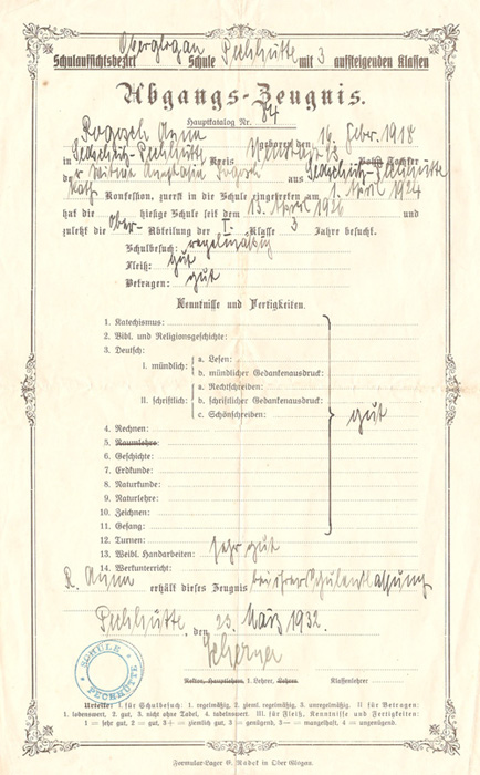W skład znaleziska wchodzą: świadectwo ukończenia pierwszych dwóch klas szkoły (Abgangs-Zeugnis) z 23.03.1932 r.,świadectwo ukończenia szkoły (Entlassungs-Zeugnis) z 25.03.1937 r. oraz zeszyt z wpisami dotyczącymi ukończenia poszczególnych lat nauki (Zeugnisheft).